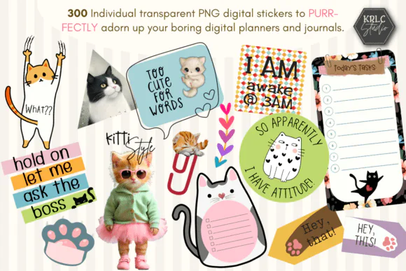 Add playful feline charm to your digital planning with this Kitty Cats Digital Planner Stickers bundle. This special edition sticker pack is created for cat lovers who want to decorate their digital planners, journals, and diaries with adorable, expressive, and non-seasonal cat-themed designs. From cute cuddly kitties to sassy cat elements, this set is perfect for making everyday planning more fun and personality-filled.
