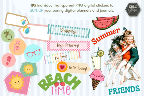 This bundle includes 195 individual transparent PNG stickers, giving you a wide variety of summer-themed elements to use in your planner layouts, journal pages, and note-taking spreads. These stickers work especially well in GoodNotes planners and can also be uploaded into Cricut Design to create your own Print & Cut sticker sheets.