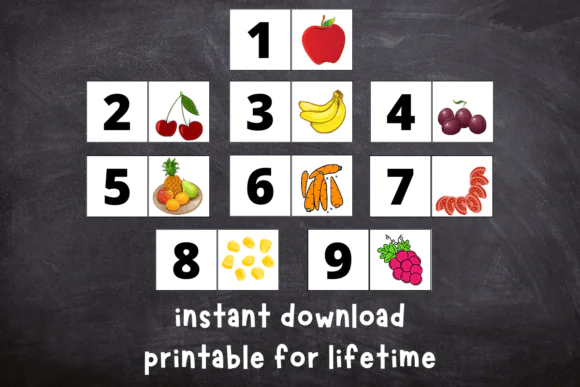 Make early math learning fun and interactive with these Learning the Numbers Flashcards for Kids. This printable puzzle-style educational set is designed to help children learn the numbers 1 to 9 by matching each number with the correct quantity of fruit.