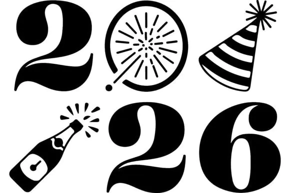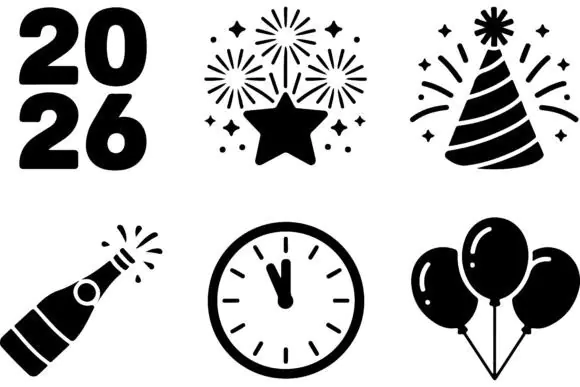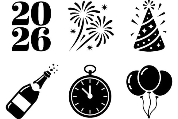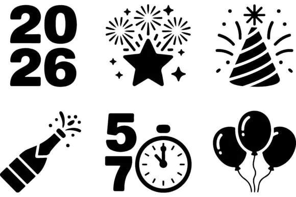 These New Year 2026 icons are a fun and practical design resource for creating festive seasonal projects with a modern, bold, and celebratory look.