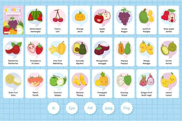 These Printable Fruits Bilingual Flashcards are a versatile and engaging resource for helping learners study fruit vocabulary in English and Indonesian while enjoying colorful, illustration-based language practice.