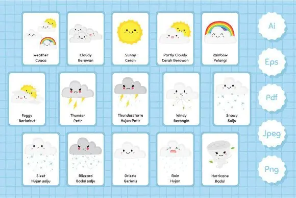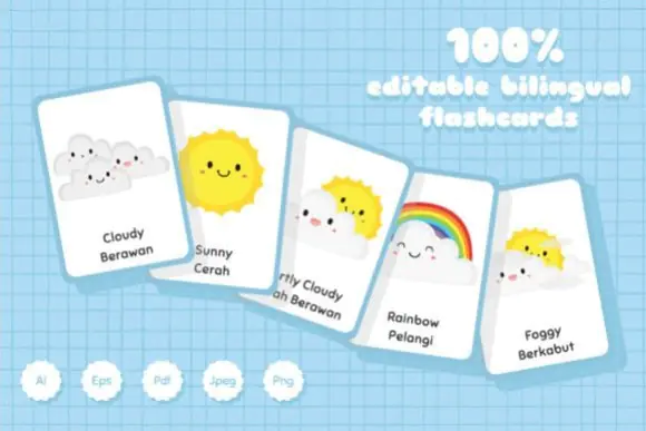 These Printable Weather Bilingual Flashcards are a versatile and engaging resource for helping learners study weather vocabulary in English and Indonesian while enjoying colorful, illustration-based language practice.