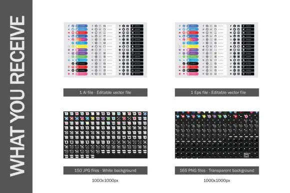 The package includes 1 AI file, 1 EPS file, 165 PNG files at 1000 x 1000 px with no background, and 150 JPG files at 1000 x 1000 px with white background. The AI and EPS files are vector-based, so they can be resized without losing quality, and the styles and colors can be edited according to your needs.