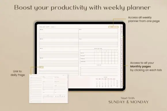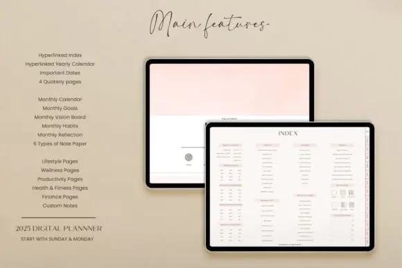 This planner includes daily, weekly, and monthly planning pages, along with Sunday and Monday start options, giving you flexibility to plan in the way that suits you best. It contains 600 pages in landscape mode, plus 5 custom notes pages with hyperlinked tabs and an index page linked to all lifestyle planning pages for faster access.