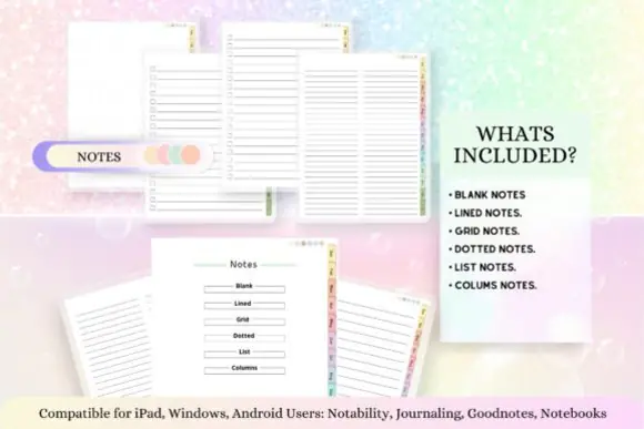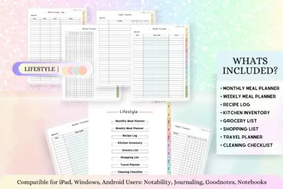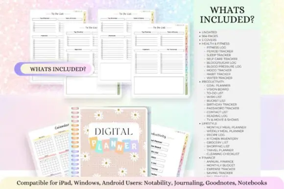 This planner comes in a vertical 11 x 8.5 inch format and includes instructions and guides to help you get started. It also includes a free 5-page sticker book in a soft blue and pink style, adding extra value for digital planning and journaling use.